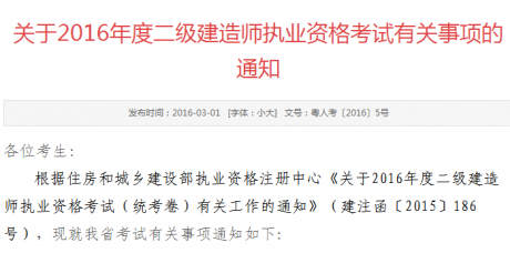 2016年03月01日,广东人事考试网发布《关于2016年度二级建造师执业资格考试有关事项的通知》:2016年度二级建造师考试报名已经开始